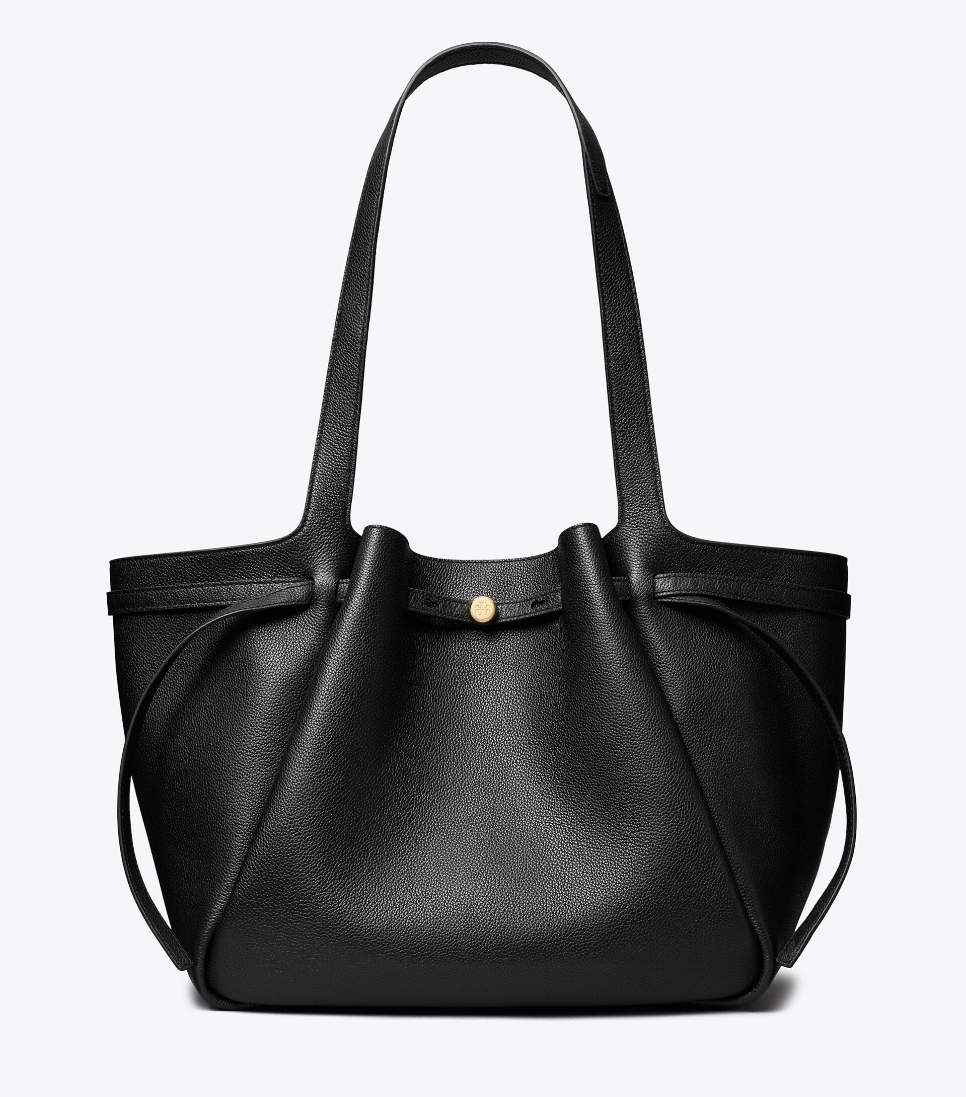 - Magnetic snap closure; belted strap with collar stud closure