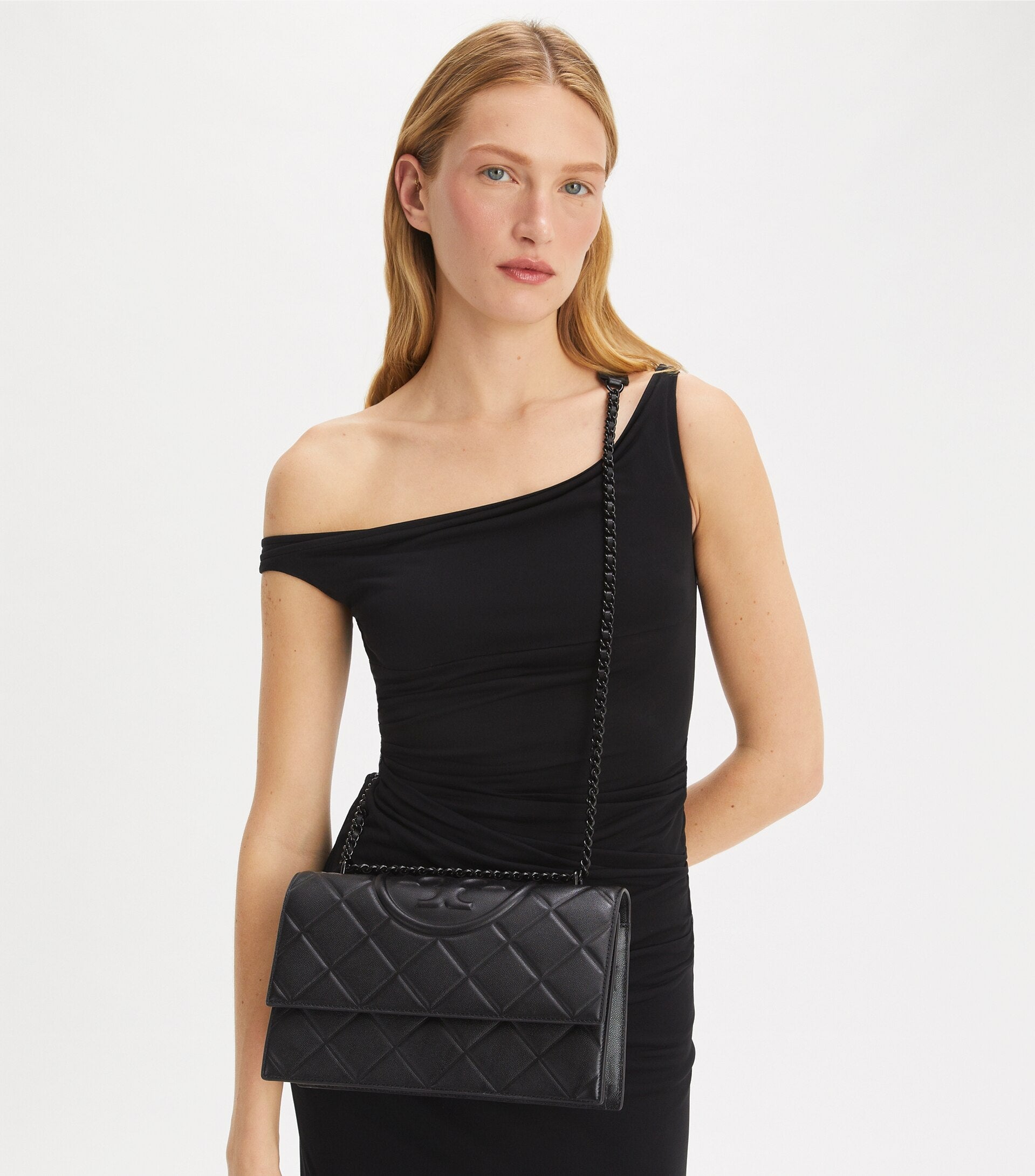 - Convertible chain and leather interwoven shoulder strap with 22.2" (56.5cm) drop; leather shoulder guard for comfort